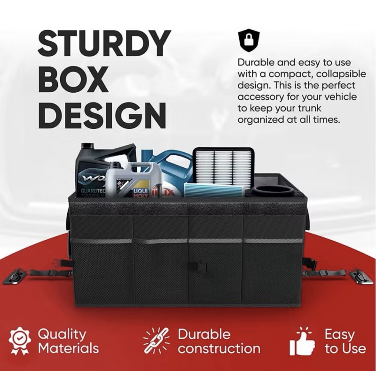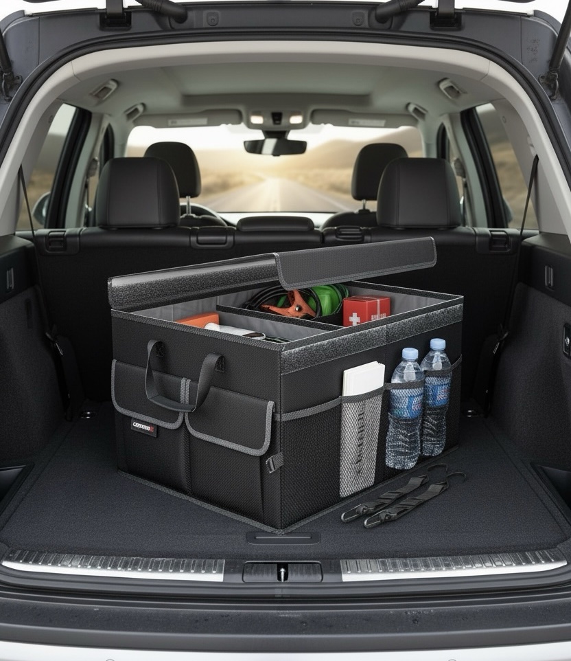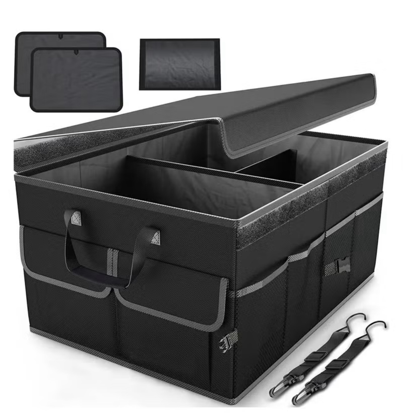 Home   »   Car Trunk Organizer 57L / 2 Compartments / Non-Slip Bottom / 25 kg Max Load / Sturdy Handles / Mesh Pockets – Black