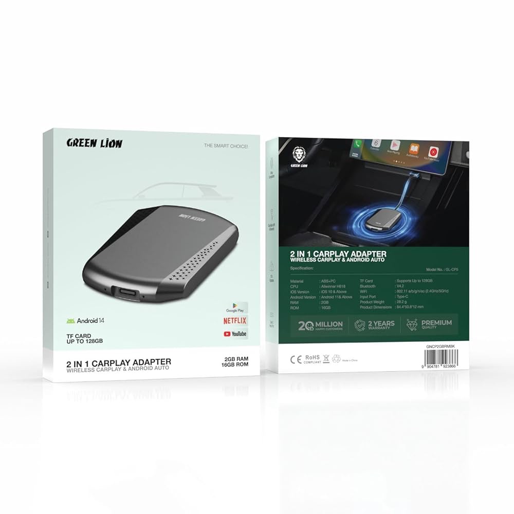 Home » Green Lion 2 In 1 Carplay Adapter Wireless Carplay & Android Auto, Android 14, 16Gb ROM, Dual-Band Wifi & Bluetooth, OTA Upgrade, USB Type-C Input Port, Wide Compatibility – Black (2GB RAM)