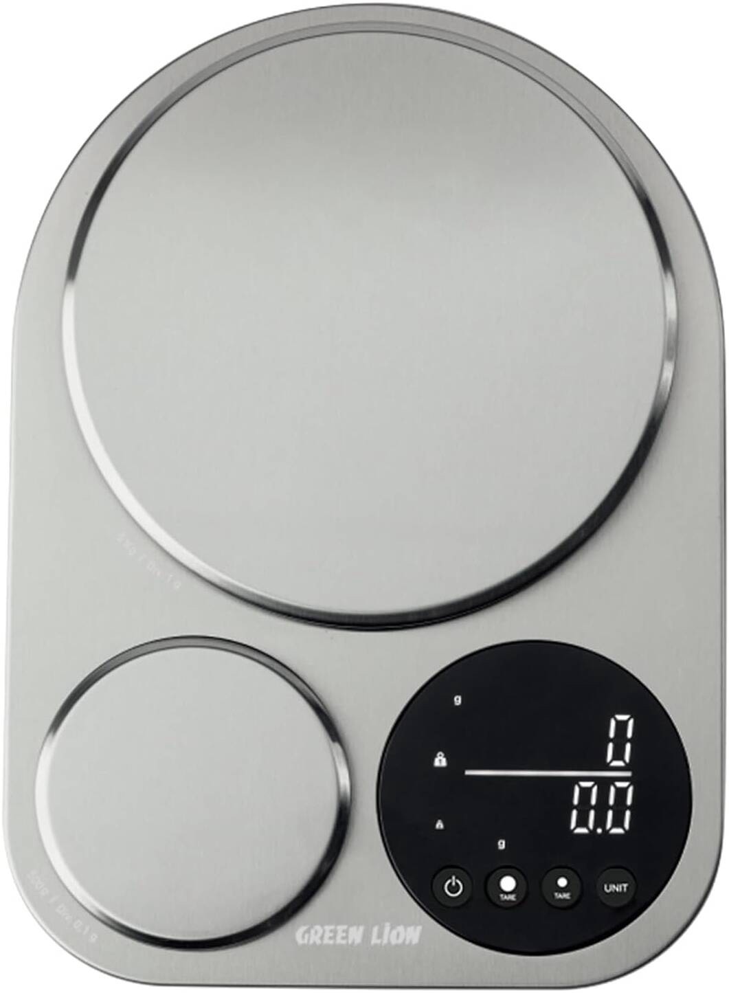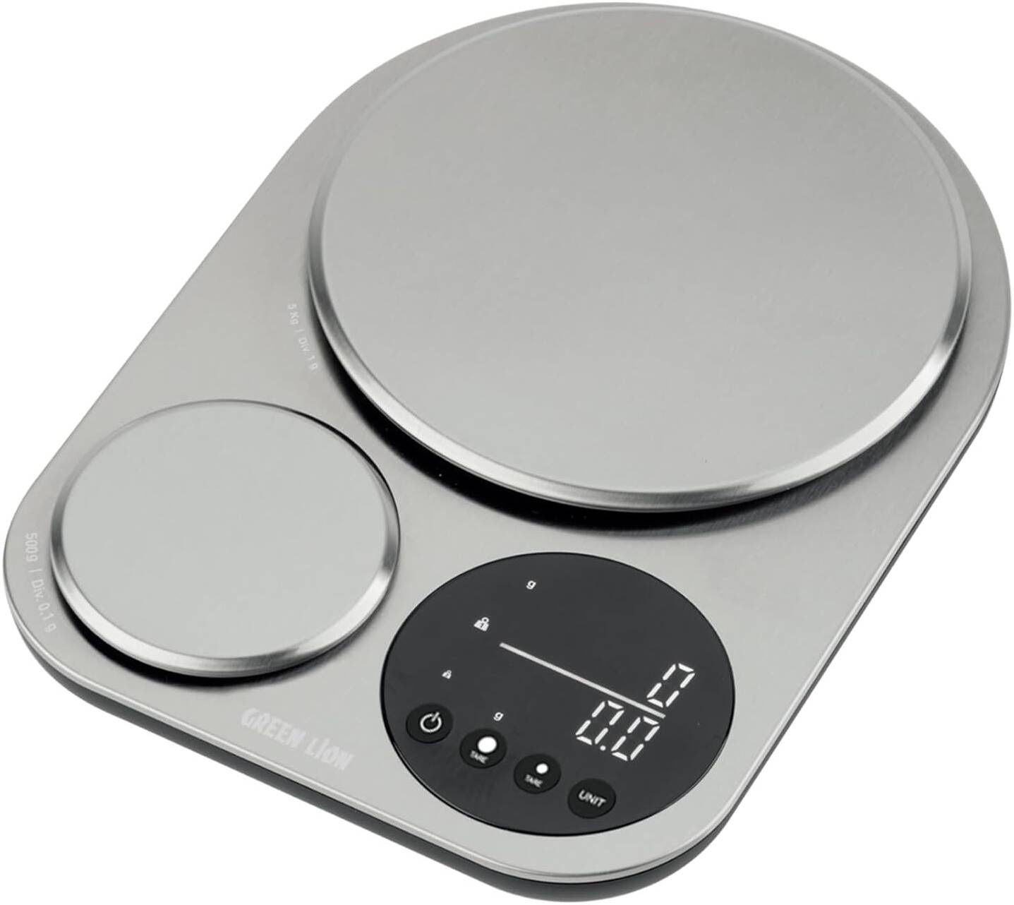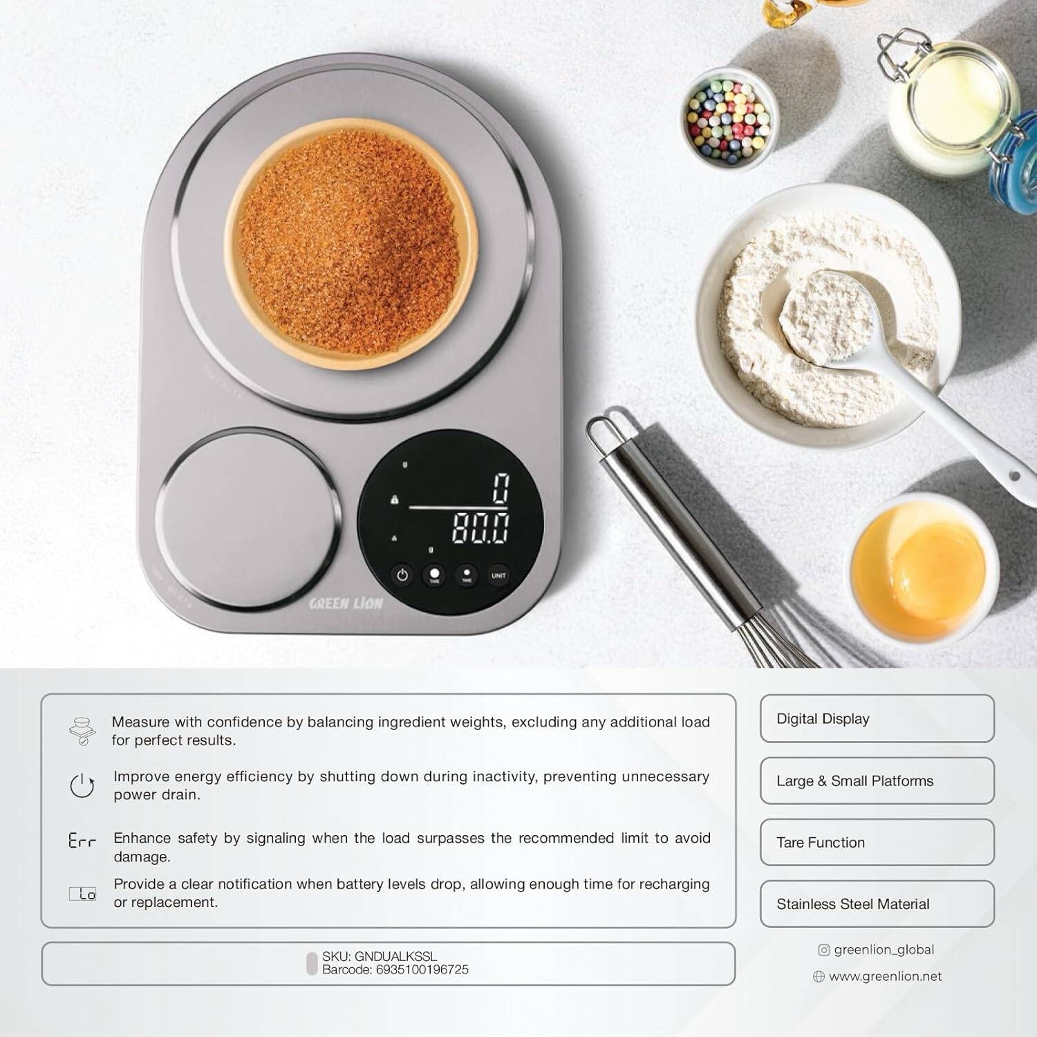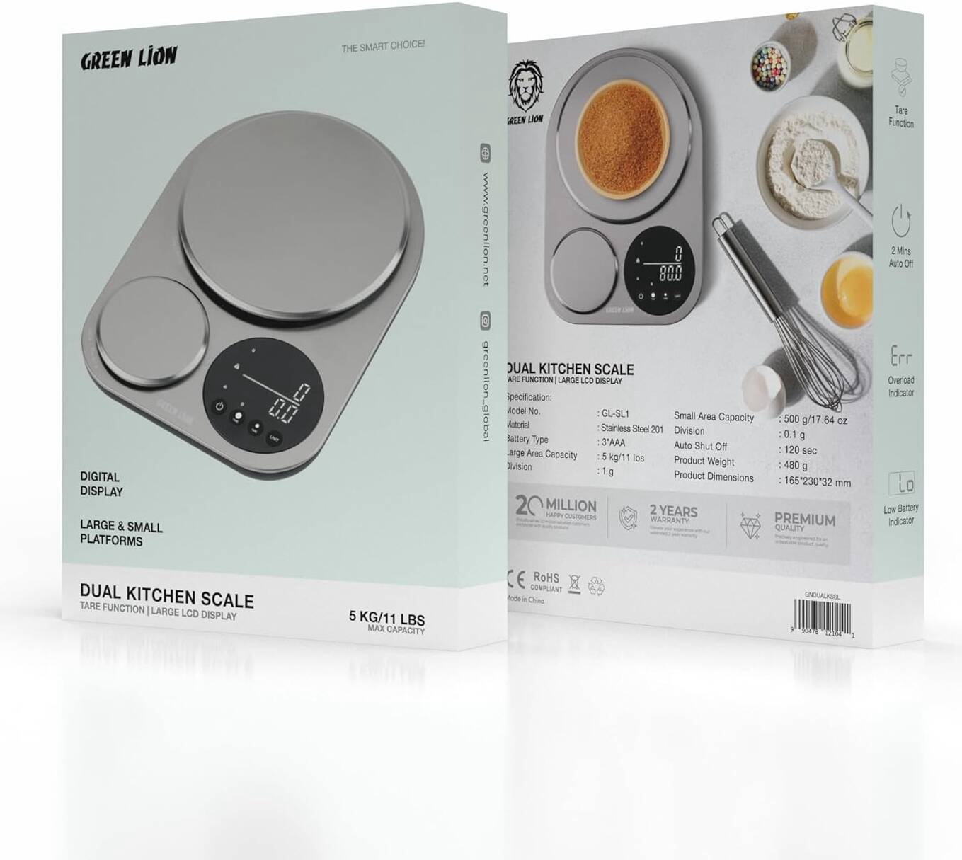 Green Lion Dual Kitchen Scale, Digital LCD Display, Dual Platform, 5 kg & 500 g Capacity, Precision Weighing, Tare Function, Auto Shut-Off, Low Battery & Overload Indicator – Silver