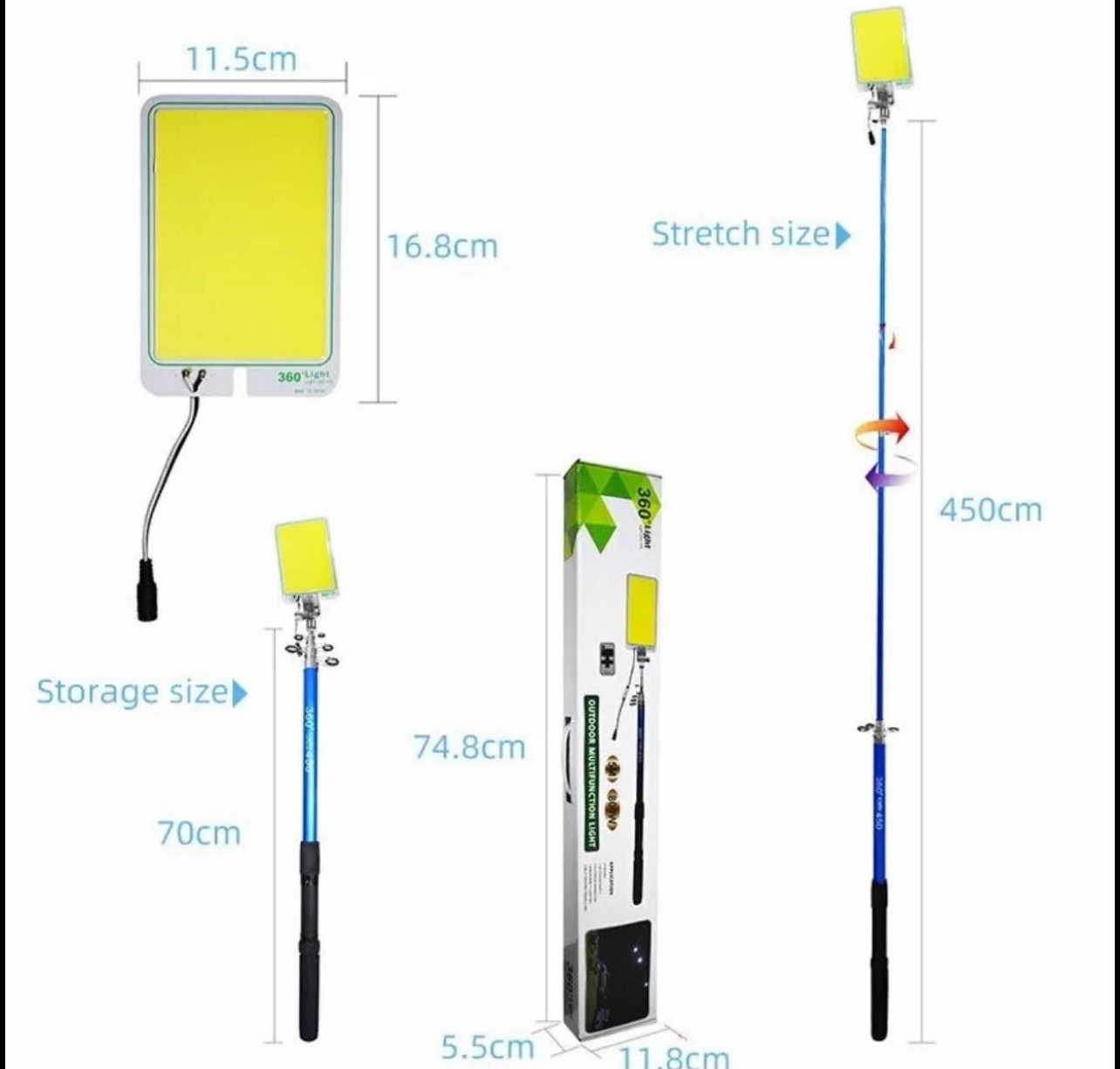 Portable Telescopic Light Outdoor Camping LED Lantern Rod DC 12V 500W LED Rechargeable Fishing Lights Feature: 1. For outdoor activities, such as fishing, hiking, camping or traveling, this lighting tool is quite a must have. This lamp, due to its particular design, will bring you more convenience than ordinary ones. 2. The retractable design makes the lamp flexible to use, and it won’t take up too much space when not in use. And its height also can be adjusted as needed. 3. This light can emit the bright and soft light, which can easily guide your directions in the darkness, which is very practical. 4. It can be connected to car battery or any 12V battery for charging, very convenient..